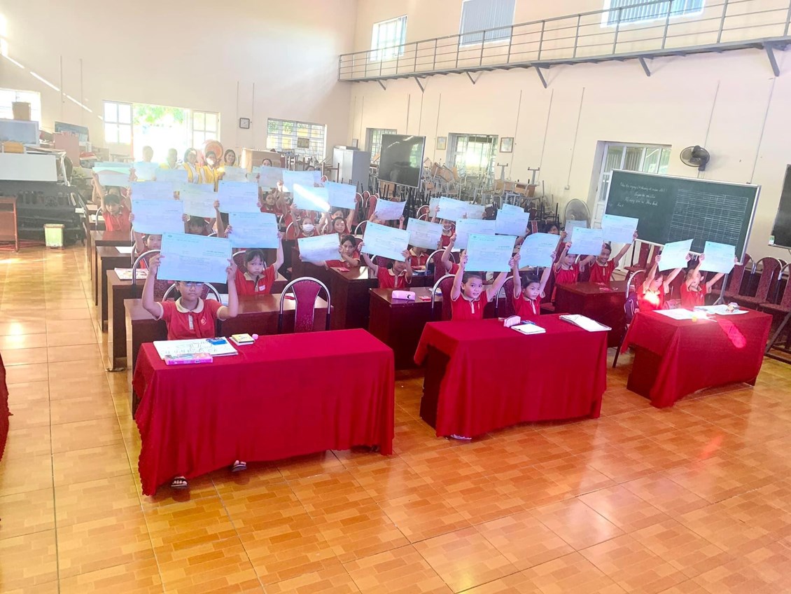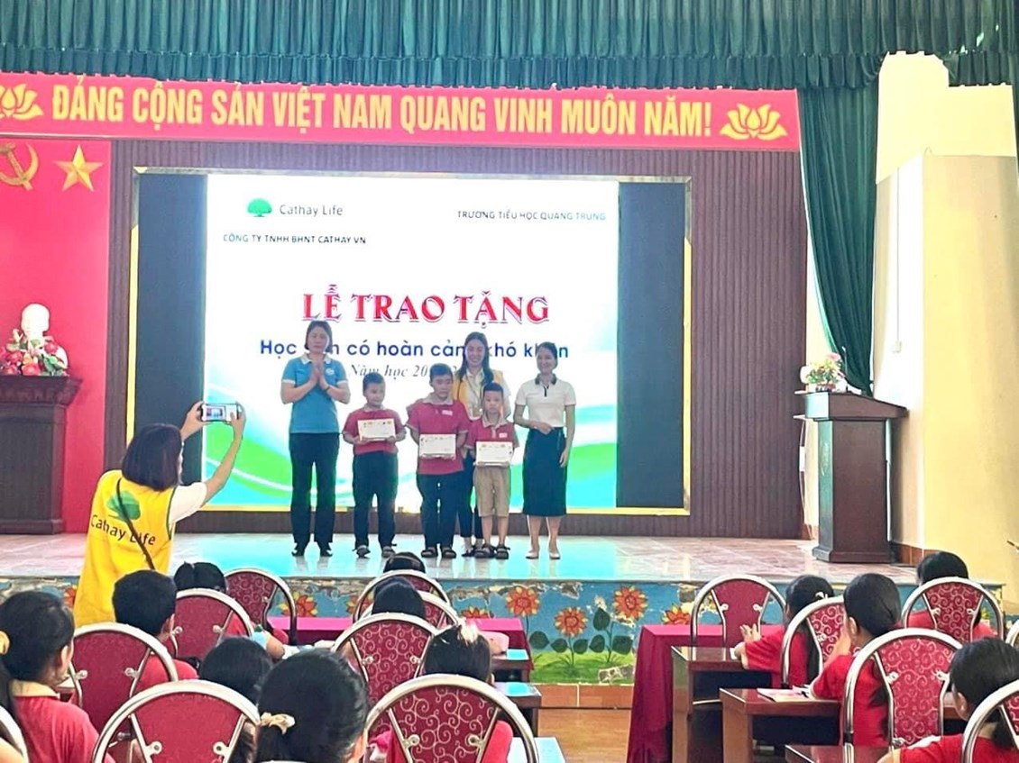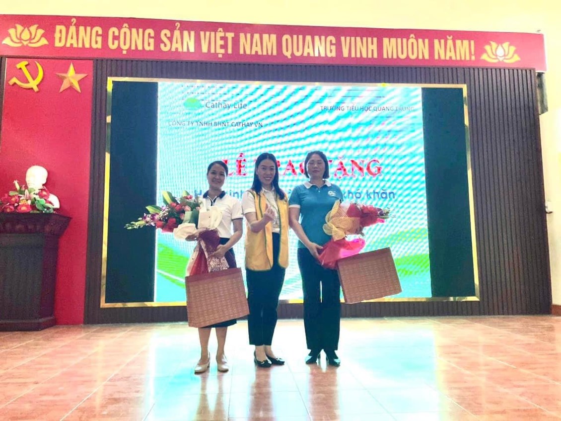 Cũng trong cuộc thi vẽ tranh, Công ty bảo hiểm Cathay đã kết hợp với Hội phụ nữ xã Quang Trung trao tặng 03 suất quà mỗi suất quà trị giá 300 000đ cho các em học sinh có hoàn cảnh khó khăn vươn lên trong học tập đó là các em Dương Đức Nhân - lớp 1D, Tạ Xuân Chí - lớp 4E, Đỗ Minh Phúc- lớp 5B. Hy vọng với sự quan tâm chia sẻ của công ty bảo hiểm Cathay và các thầy cô trong nhà trường các em học sinh tiếp tục phấn đấu vươn lên trong học tập rèn luyện trở thành những người con ngoan, trò giỏi xứng đáng cháu ngoan Bác Hồ kính yêu!