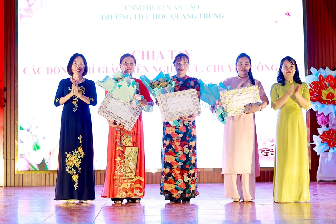 Nhà trường đã tiếp xúc chia tay đ/c Vũ Thị Yên, Nguyễn Hồng Liên nghỉ hưu theo chế độ, đ/c Nguyễn Thị Quyên chuyển công tác với bao tình cảm lưu luyến, ấm áp, yêu thương. Tập thể nhà trường đã có những món quà, bó hoa tươi thắm gửi tới các đồng chí mong rằng các đồng chí sẽ tiếp tục phát huy phẩm chất tốt đẹp của nhà giáo, luôn nhớ về ngôi nhà TH Quang Trung thân yêu.