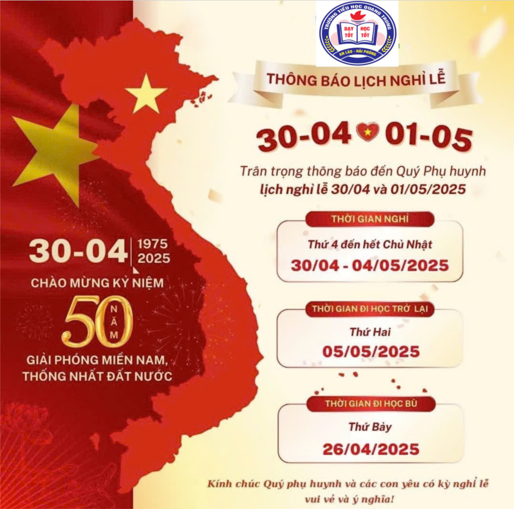 🏘️ Trường Tiểu học Quang Trung trân trọng thông báo tới thầy cô giáo, quý phụ huynh, các em học sinh về lịch nghỉ Lễ Giải phóng miền Nam 30/4 và Quốc tế Lao động 01/5 như sau: