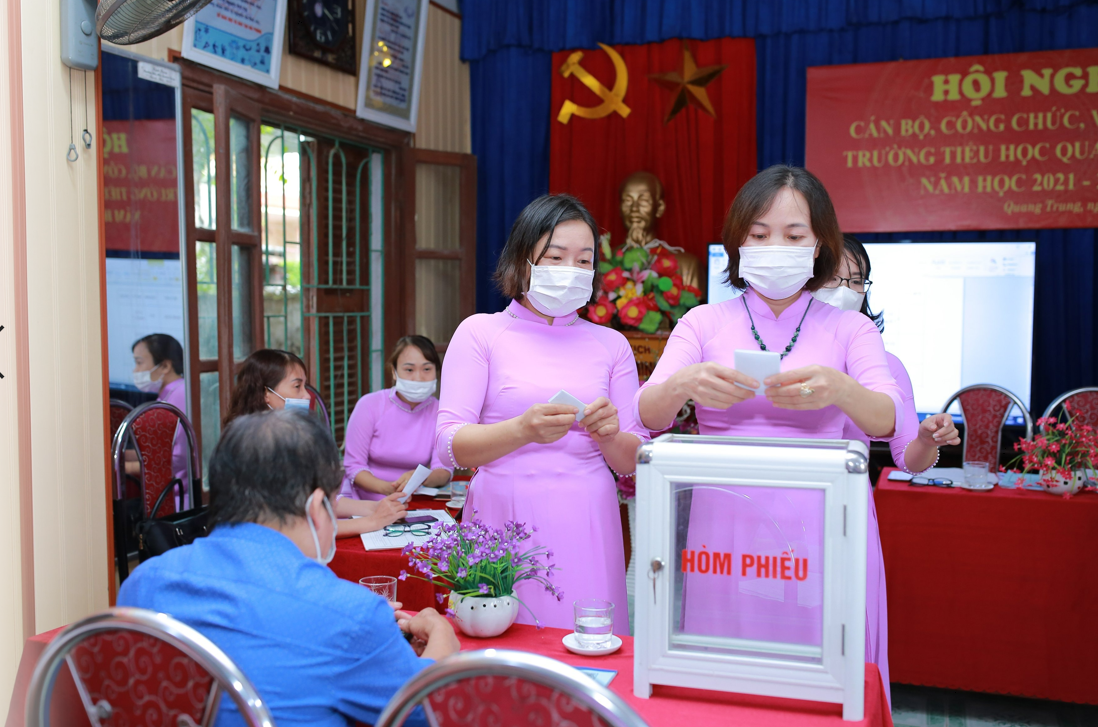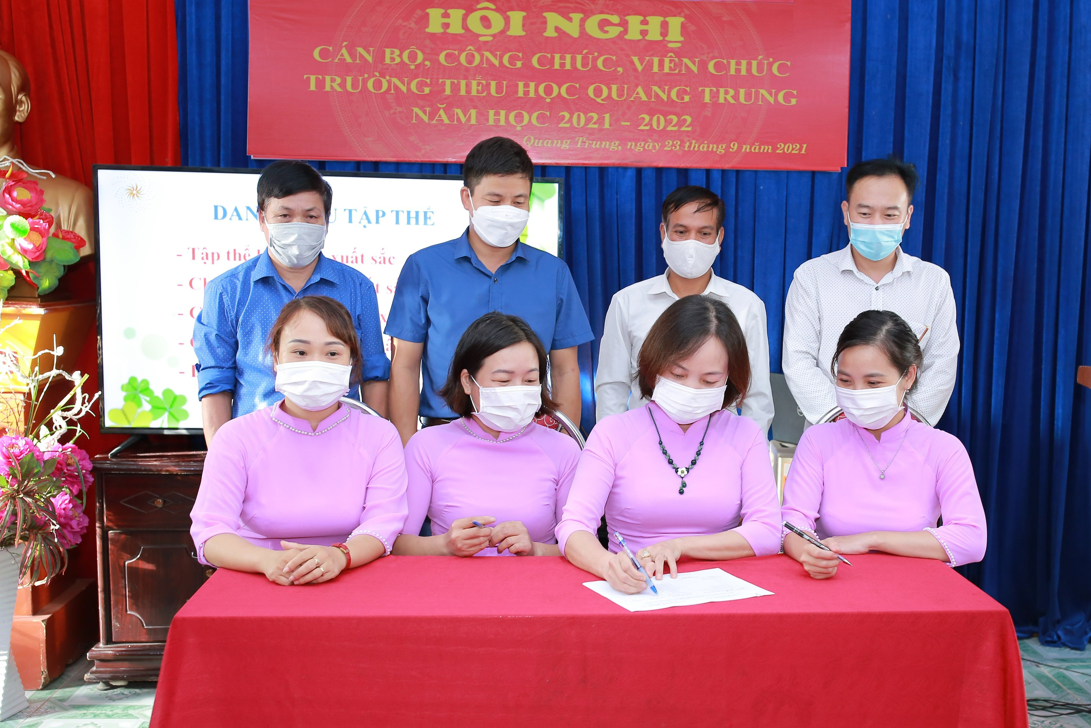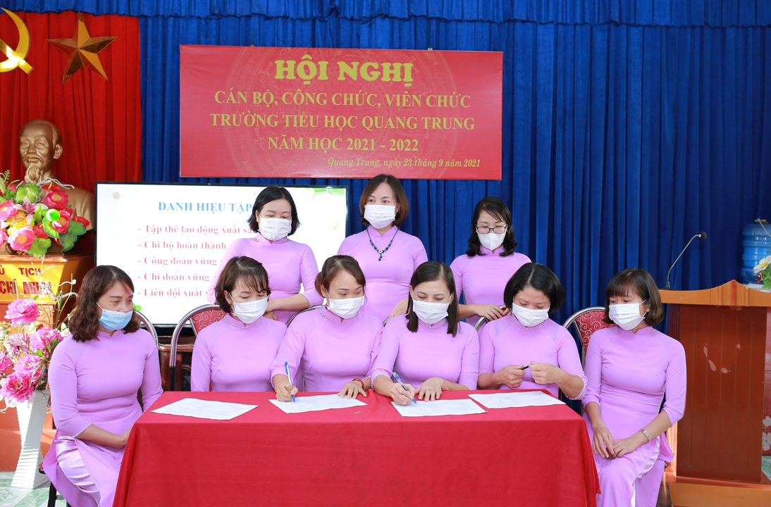 Sau một thời gian làm việc khẩn trương, nghiêm túc và dân chủ Hội nghị đi đến thống nhất phương hướng, nhiệm vụ năm học 2021-2022. Để thực hiện thắng lợi nhiệm vụ năm học với các chỉ tiêu đề ra. Tập thể CB, GV, NV nhà trường cùng nhau quyết tâm khắc phục mọi khó khăn, thi đua thực hiện tốt các nhiệm vụ được giao, tích cực tham gia các phong trào thi đua, các cuộc vận động, xây dựng tập thể đoàn kết thống nhất cao xứng đáng với niềm tin mà các cấp ủy đảng chính quyền, các bậc phụ huynh học sinh và nhân dân trao gửi. Quyết tâm xây dựng Trường Tiểu học Quang Trung phát triển vững mạnh!