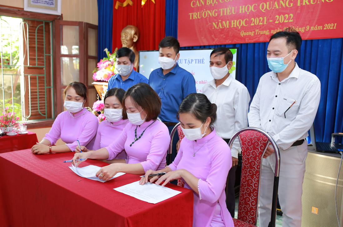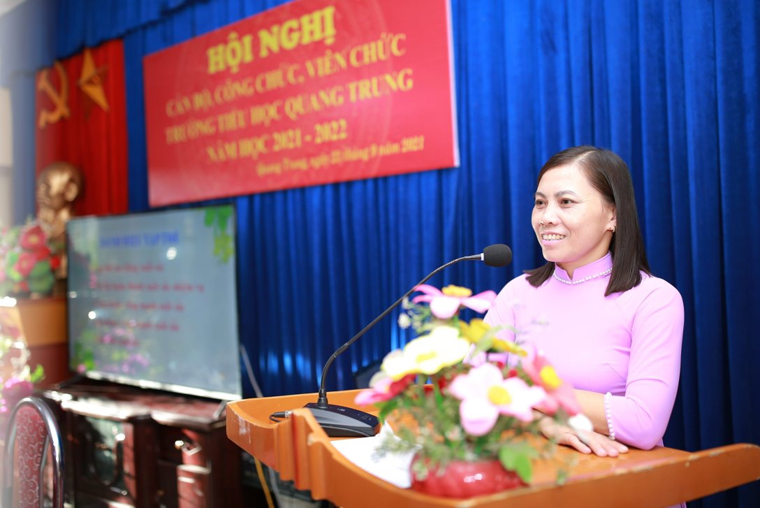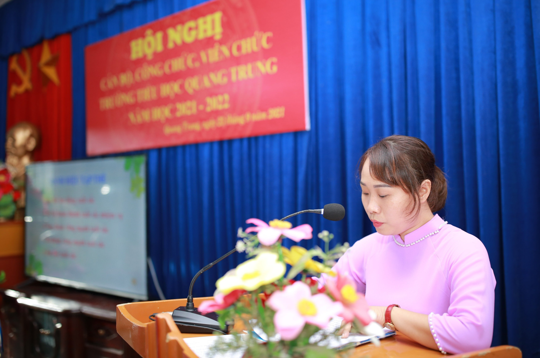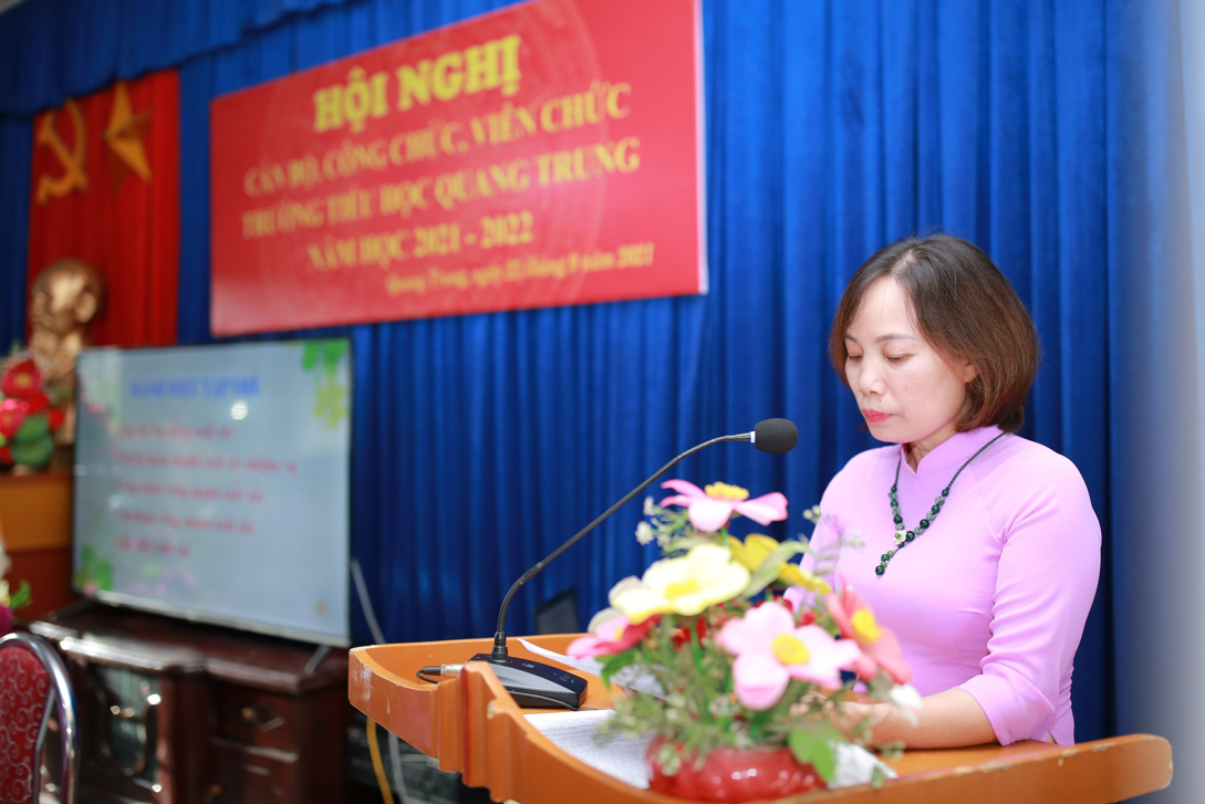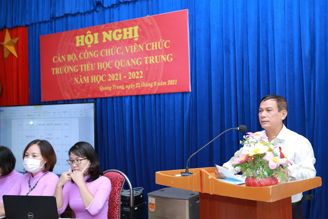 Tại Hội nghị ông Trịnh Văn Tốt – Bí thư Đảng ủy, Chủ tịch HĐND xã thay mặt lãnh đạo xã Quang Trung ghi nhận thành tích nhà trường đã đạt được trong năm học trước và động viên, khích lệ, chỉ đạo tập thể CB, GV, NV nhà trường tiếp tục phát huy tinh thần trách nhiệm, đoàn kết, năng động , sáng tạo hoàn thành xuất sắc mọi nhiệm vụ của năm học mới 2021-2022.