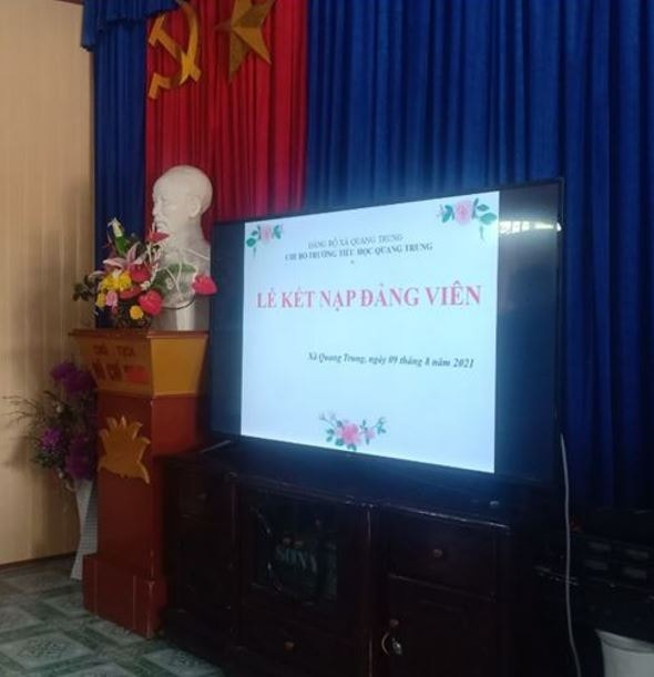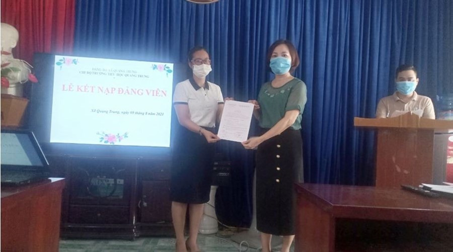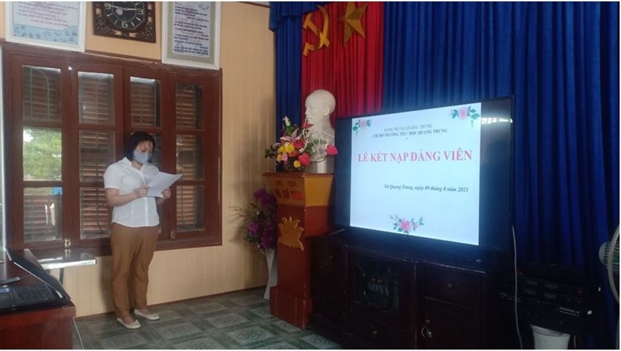Thực hiện Nghị quyết đại hội chi bộ nhiệm kì 2019 - 2022, sáng ngày 19/08/2021, Chi bộ trường Trường Tiểu học Quang Trung long trọng tổ chức lễ kết nạp Đảng viên mới cho 2 đồng chí quần chúng ưu tú: Nguyễn Thị Minh Ngọc và Đỗ Thị Hường. Được sự giúp đỡ của Chi bộ trường Tiểu học Quang Trung cùng với sự nỗ lực phấn đấu của bản thân, các đồng chí đã được kết nạp vào Đảng Cộng Sản Việt Nam. Đây là sự kiện có ý nghĩa quan trọng trong công tác xây dựng Đảng, công tác bồi dưỡng đoàn viên ưu tú trong nhà trường nhằm góp phần phát triển, nâng cao chất lượng và sức chiến đấu của Chi bộ trường nói chung và các cá nhân Đảng viên nói riêng.