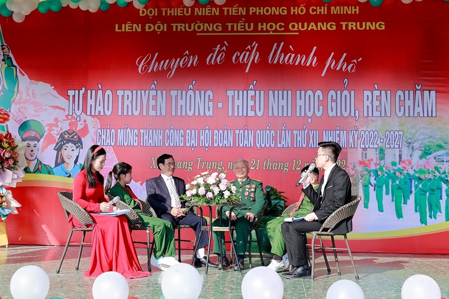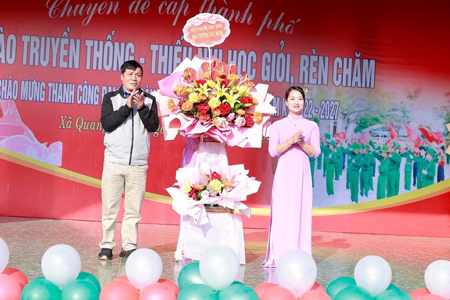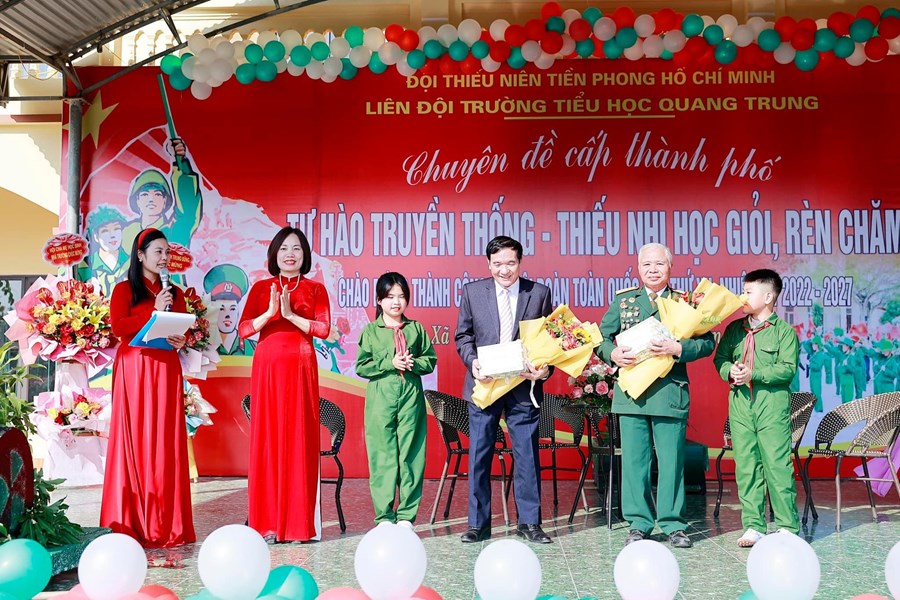 Về dự chuyên đề của trường Tiểu học Quang Trung hôm nay, nhà trường vinh dự được đón tiếp các quý vị đại biểu khách quý: Đại diện lãnh đạo Trung tâm dạy nghề thanh niên TP; Trạm Sửa chữa Trung Dũng;Lữ đoàn TT 603; Đại diện lãnh đạo Phòng giáo dục và đào tạo, Bí thư huyện đoàn An Lão; Các đại biểu đại diện lãnh đạo Đảng ủy, UBND, Ban quân sự, Bí thư đoàn thanh niên xã cùng các ông bà trưởng ban đại diện CMHS các lớp. Đặc biệt 2 vị khách mời giao lưu: Bác Vũ Văn Khang- Nguyên chiến sĩ Bộ đội đặc công- Bí thư thôn Câu Hạ A và Bác Dương Đức Thoại – nguyên bí thư thành đoàn, thành phố Cẩm Phả. Giám đốc công ty cổ phần dịch vụ Cảng Cẩm Phả- tỉnh Quảng Ninh.