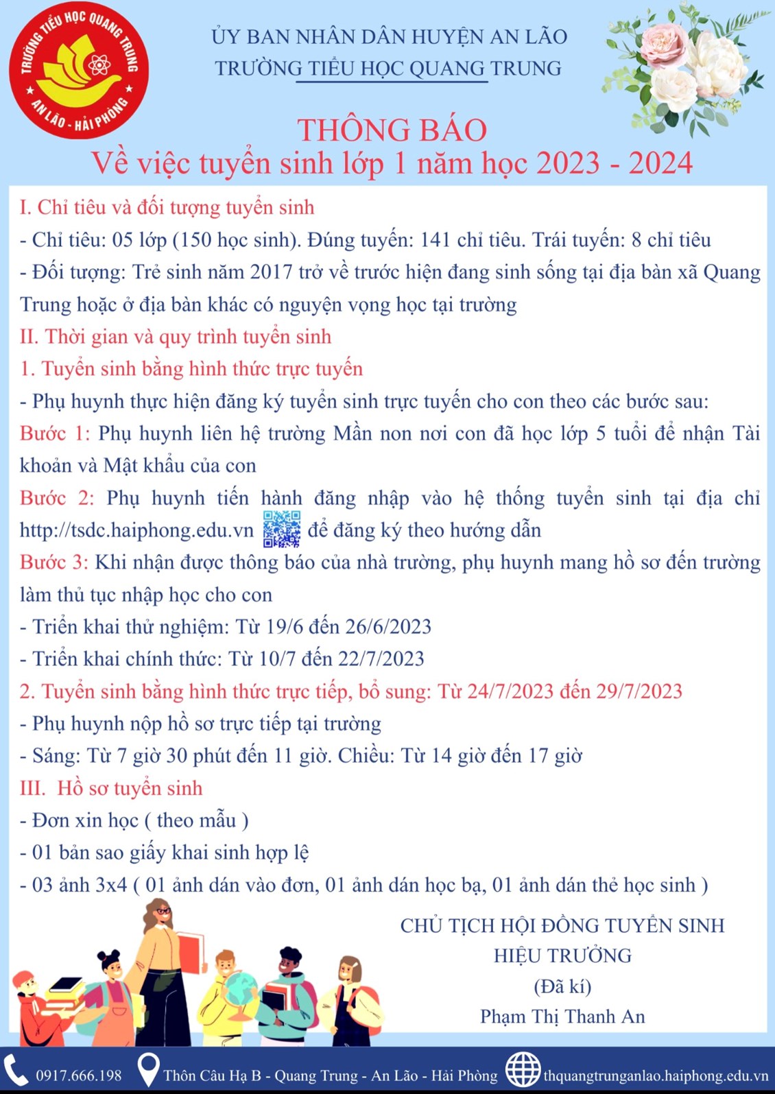 Thực hiện kế hoạch tuyển sinh năm học 2022-2023, trường Tiểu học Quang Trung trân trọng thông báo tuyển sinh lớp 1 năm học 2023-2024